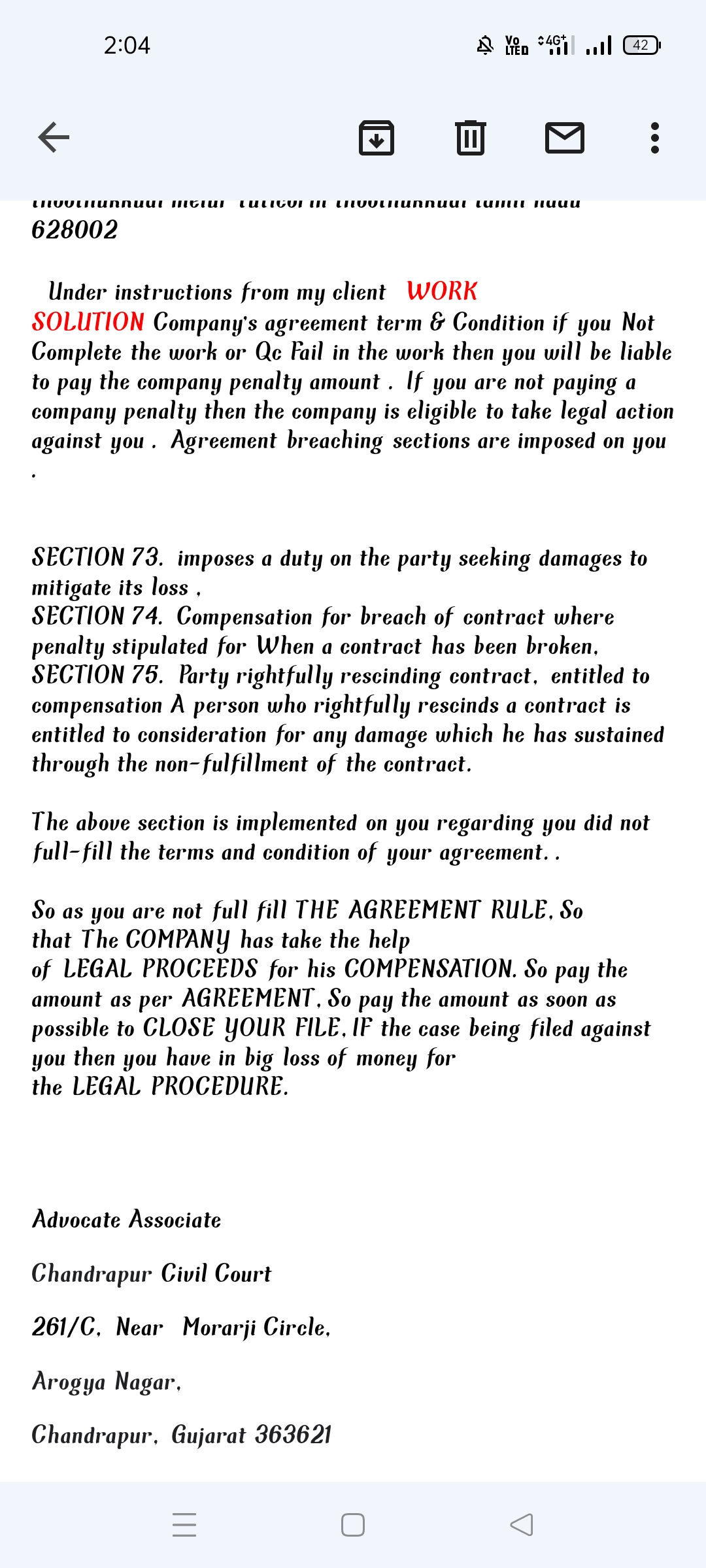 As I have finished my degree I have searched many jobs in social medias ,then this work solution gave me a job ,after I signed the agreement only he told me about the penalty fees , if he told it earlier,I didn’t signed to this agreement,today morning advocate associate from Gujarat called me about this case ,please help to get relief from this , after the company told about the penalty I didn’t start any work ,please help me ,I can’t afford so much money,if the blackmails passed again I’ll suicide,please help me,I didn’t know anything about this company but now I know it