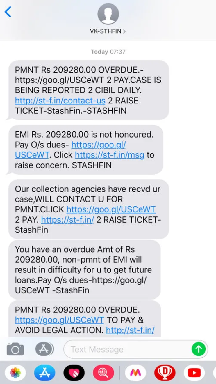From that time I stopped the payments and they started damaging the CIBIL. Sending SMS messages of unknown amount 209280 INR – 2 lakh 92 thousand and 80 Rupees.