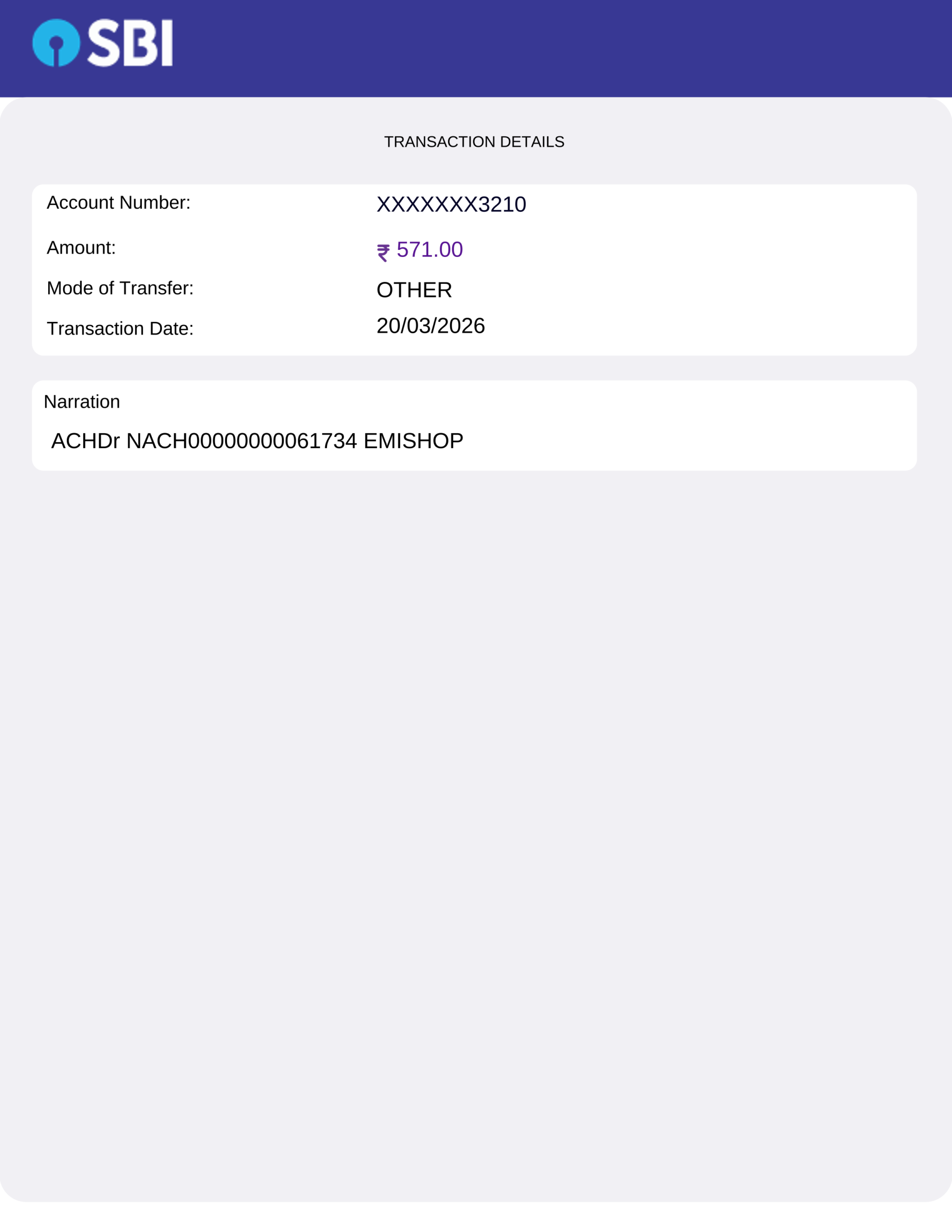 I am account holder state bank of india 20/032026 SBI ACCOUNT WAS 571 RUPEES DUE YO EMI SHOP BUT I COULD ANY EMI SHOP DO NOT NO PRODUCT Purchases THIS EMI SHOP SIDE AND ANY LOAN NOT RUNNIG THIS SUDE