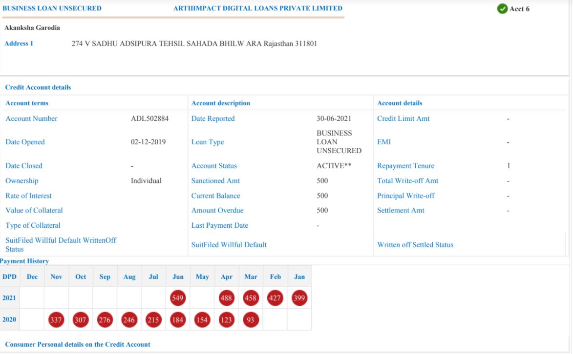 I have not taken any loan from ARTHIMPACT DIGITAL LOANS PRIVATE LIMITED. But in CIBIL, showing loan outstanding of Rs. 500 from ARTHIMPACT DIGITAL LOANS PRIVATE LIMITED with 20 late re-payments. Also, the number and address mentioned are incorrect. Complained a lot of times nothing is happening but CIBIL score is going down due to this.