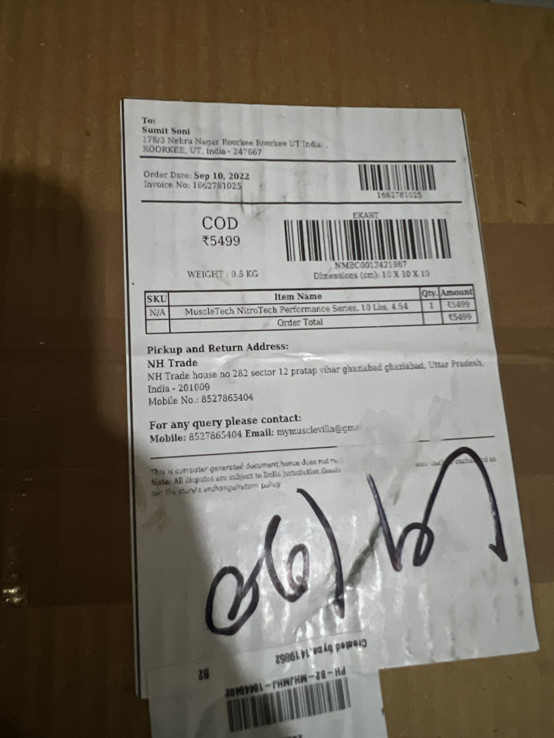 On 10th of september i ordered a muscletech nitrotech protein. On 14th of september i received a product but the product is totally wrong and local packing. From the same day i draft a mail to the nutrition store but unfortunately no one is responding over this. They dont even send the another product.