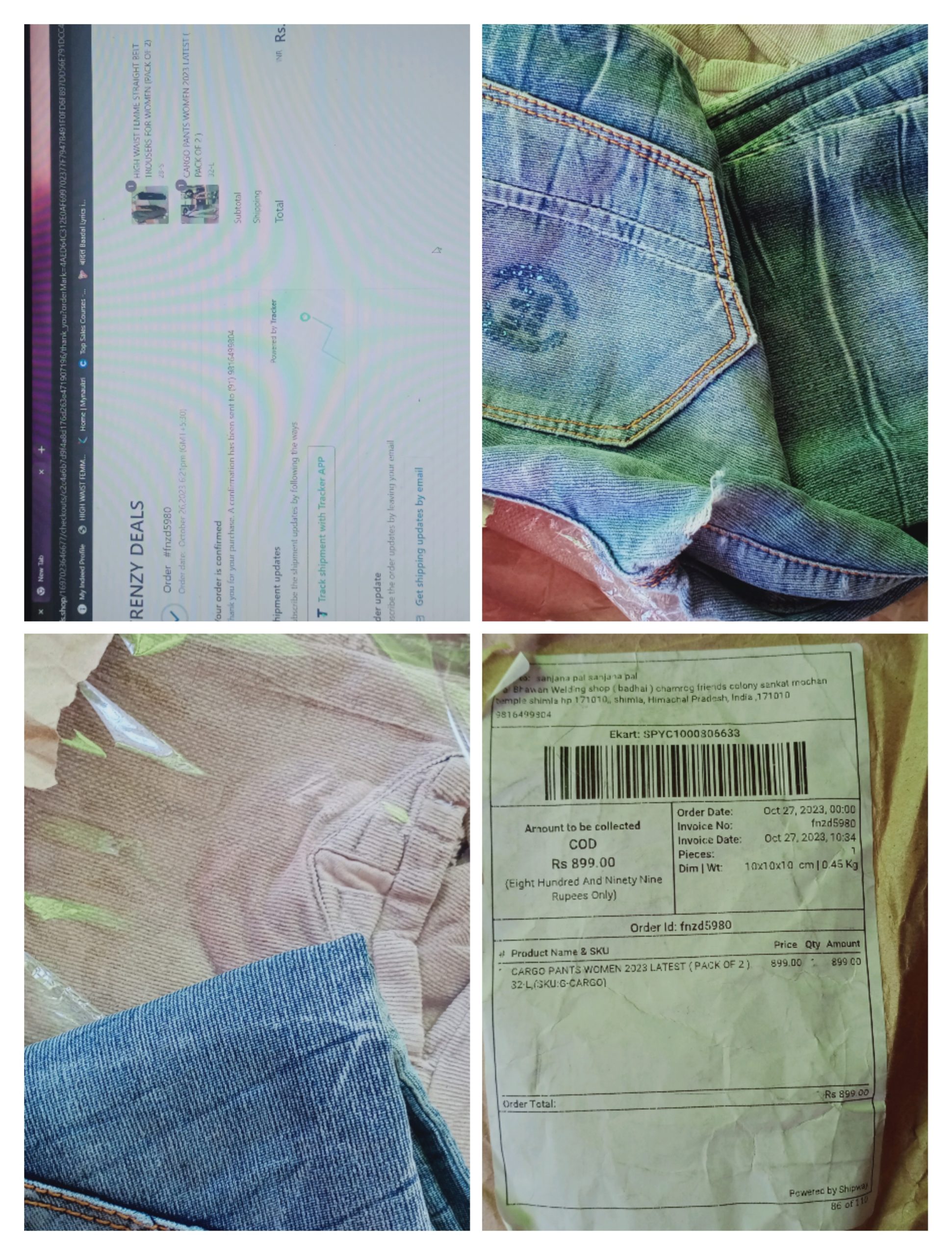 I have ordered 2 set of cargo pants from Frenzy Deals on 26-Oct-2023. I got the delivery on 1-11-2023and when I opened the pack it’s torn and used kids jeans inside. There is no customer support to call them as well. I have seen similar multiple complaints against FRENZY Deals here, kindly take the corrective action. I also want my money back.