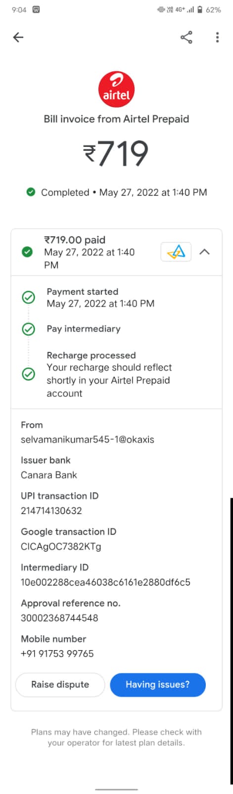 As per above-mentioned, I have wrongly recharge Rs. 719 monthly plan (instead of 7539976538 )