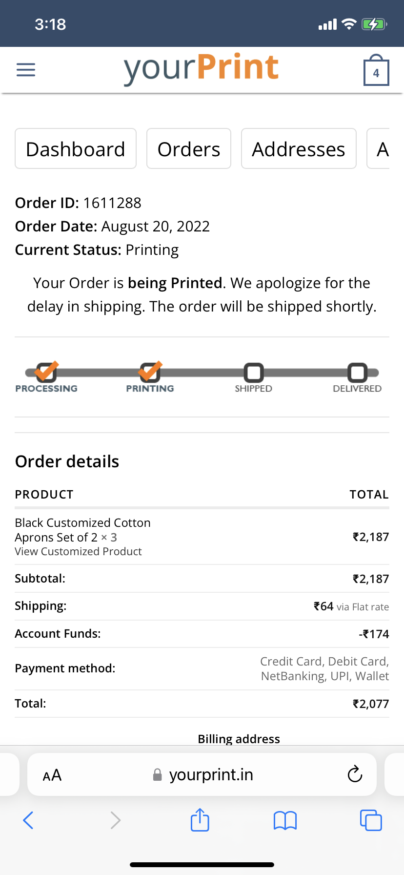 I had ordered 6 customised print aprons on 21 August, 2022. The aprons went for printing on 21st august 2022. I had needed it for a cooking event on 1st September. When I asked them to cancel on 5th Sep, they told me the product was in print and they can’t cancel. With no updates, I again contacted them to cancel and refund on 10th Sep, they told me the order was in print and will ship in 24 hrs. And if I cancel, they won’t refund the money.