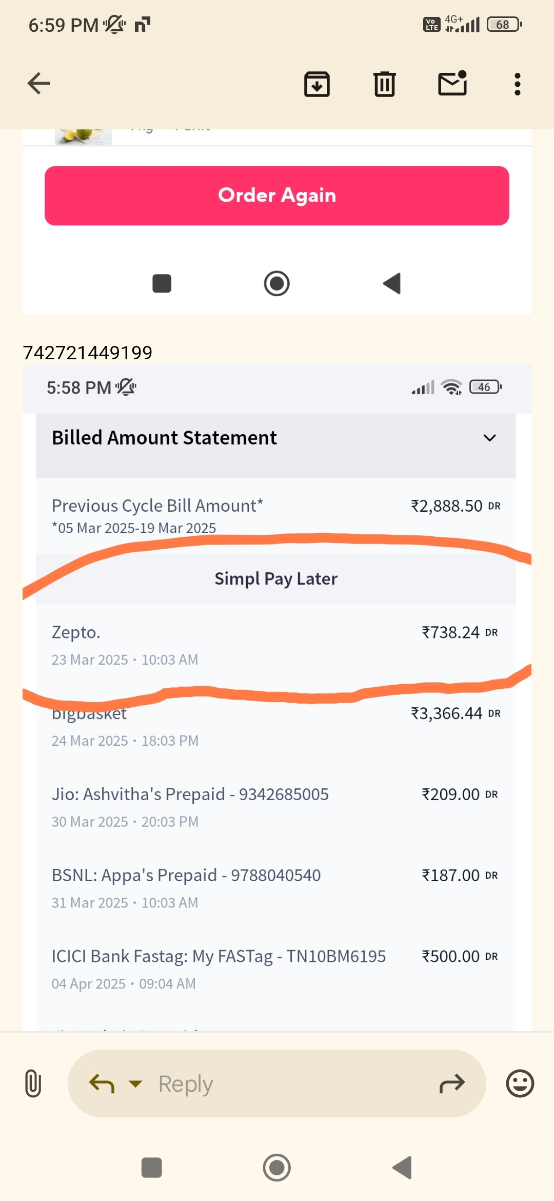 I had ordered goods online from Zepto on March 23rd through SIMPL pay later.The goods did not arrive and I had to register the order as delivery on the Zepto app.