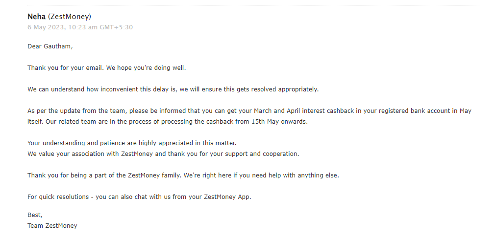 I have taken a zero interest emi for buying my phone from Happi mobiles, Hyderabad. The cost of the phone was INR 45999, and i was charged 50000 rupees and told that i will get the refund after paying. Till this date i couldn’t see any refund amount credited to my account. As you know I am a valuable regular customer of zest but here I felt like being looted. Once i was charged for late payment fee where i have already paid on time before it get auto deducted. The customer support team of yours are always busy and had to wait hours to connect with them but still couldn’t connect. I have raised a ticket and they said that they will initiate my refund within 10 days. then it postponed to April Last, Then to May 1st week, then to May 15. Now they are saying that they will initiate payment by June 10nth.