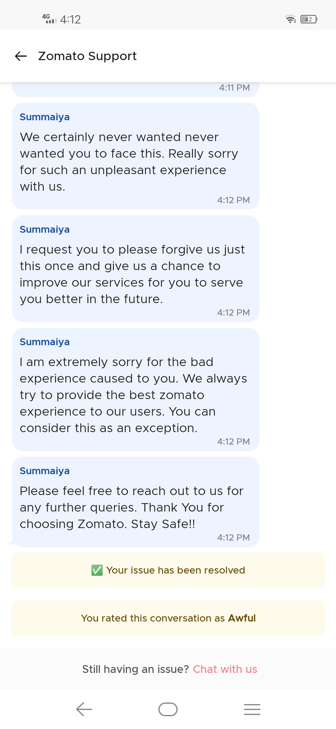 please see the SS which i requested to follow in my food, and see there chat reply without my reply they close the issue.
