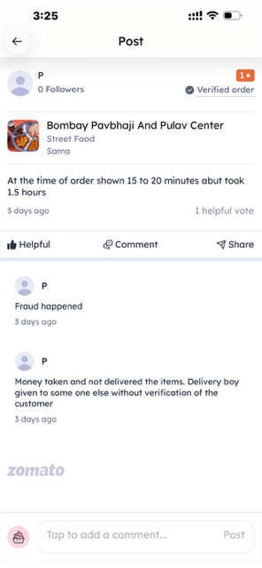 Payment taken and delivery of food no given to me on 11th Feb 2026 9pm, order no7798937946. I called them for delivery, so delivery boy told, it is already delivered, but without verification item given to some one else, I i told to give the refund also online company on Zomato app given. But no response till date